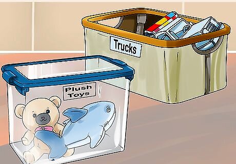Use storage bins. Keep the new toys organized by using storage bins. Clear plastic storage bins that are deep and narrow are good for storing toys. The clear plastic can make it easy for your child to see the toys in the bin. Soft bins made of fabric or woven material are also good for smaller children, especially if they cannot lift heavy bins on their own. Label the bins so they are organized and it is clear what is inside them. For example, you may have a label that says “Trucks” for toy trucks or a label that says “Plush toys” for stuffed toys. Keep smaller toys in small bins and larger toys in large bins. Do not fill the bins too high with toys so it is easy for your child to take toys in and out.