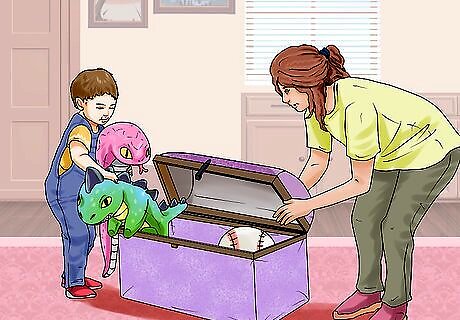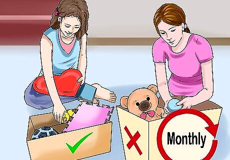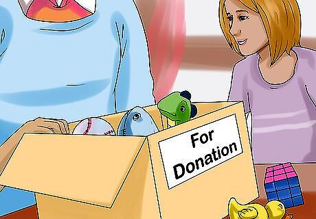 Help your kids get used to giving away toys. To reduce the number of toys in your home, get your kids used to giving away toys they no longer play with or use. One option is to allow your kids to have only a certain number of toys in their play zone at once. Tell your kids they are only allowed to have a certain number of toys and that they have to let go of any toys if they go over this number. It’s important to involve your child in deciding which and how many toys to donate. If they refuse to make a decision, give them 2 options to help them feel in control of the process. For instance, you could say, “Are you going to donate 4 toys or 5 toys?” You can also encourage your kids to make yes/no piles for their toys where they decide to keep or give away toys. Ask your child, "Do you play with this toy every week?" or "Would I keep this toy in my room and play with it?" If their answer is "no," the toy might need to go in the "no" pile to then be given away. Create a “maybe” box for toys if your child finds it hard to make a decision. Tell your child to put any toys they are tired of or do not play with often in the box to maybe give away. Then, you can look over the toys at the end of the month with them and decide if any of them can be donated or given away.