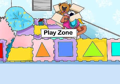 Create a play zone in your home. To keep all your child’s new toys organized, make a play zone or area in your home. This could be in your child’s room, in the living room, or in the den in your home. Use a carpet to note where the play zone ends and store your child’s toys in the play zone. Tell your child that they need to keep toys in the play zone so your house does not become cluttered with all their new toys. You can also use other physical markers like a couch or other furniture to note the play zone. Encourage your child to stay in the play zone with their toys during playtime. Instruct them that other activities like eating or sleeping are done outside the play zone.