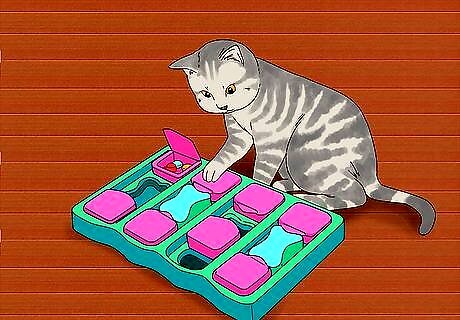 Begin with easy puzzles. Food puzzles—usually constructed of plastic or cardboard—nurture cats’ natural hunting behaviors by challenging them to get food and treats.To get your cat started with food puzzles, it is important for them to have success right away. Begin by using simple, see-through food puzzles, which are more than half full (making it easier to get the food out). You can also sprinkle some cat food (or treats) around the puzzle to encourage an association between the puzzle and food. You may also want to leave these out at night. Purchase food puzzles at pet stores or online, or make them yourself at home. Food puzzles are available in a variety of styles and levels of difficulty.