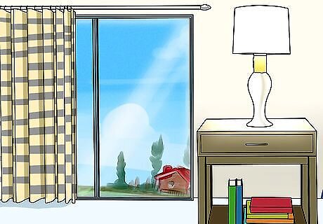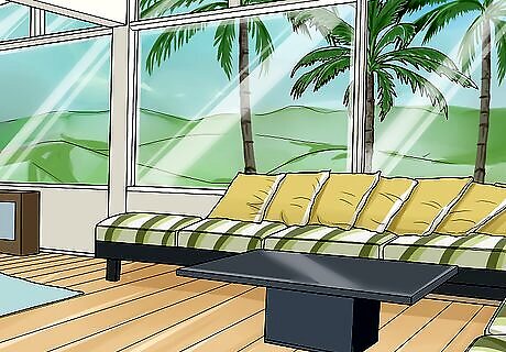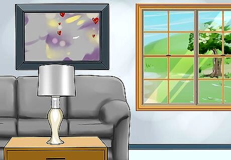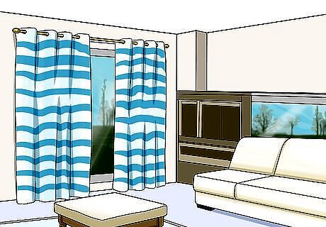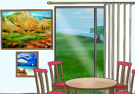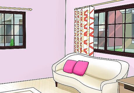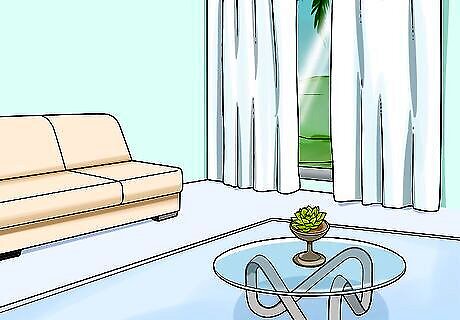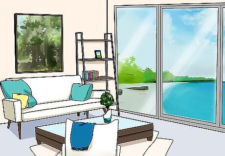 Pick light colors for an airy effect. If light and airy is what you're going for, try choosing whites, creams, light blues, and yellows for a bright effect. Let in natural light by picking sheer curtains or opening them during the day. Add track or recessed lighting for more brightness at night. Add pops of color with light blue pillows and gold picture frames, for instance. These items will fit with the light and airy theme will adding a fun touch.