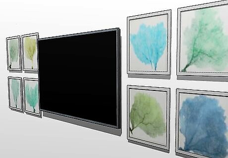 Create a gallery wall. Try arranging your favorite framed paintings, photos, or posters around the TV to show them off. Simple black frames tie photos and paintings in well with the black rectangular shape of the TV. You can even frame some favorite children’s artwork to hang – they would love it!