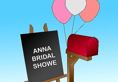 Decorate the outside of the location with an eye-catching sign or banner. Outdoor decorations can set the tone for a festive occasion and help guests find the party. Attach helium balloons to your sign, the mailbox, or the porch for extra visibility. Match the balloon colors to the colors you’ve used to decorate inside. Consider making a sign that fits the theme. If you’ve chosen a film theme, for example, make your sign look like a marquee. A banner on the door could say the bride’s name plus the groom’s name or something simple like “love” or "amour." If the party is at night, consider creating some ambiance with a string of outdoor lights around the door or the sign.