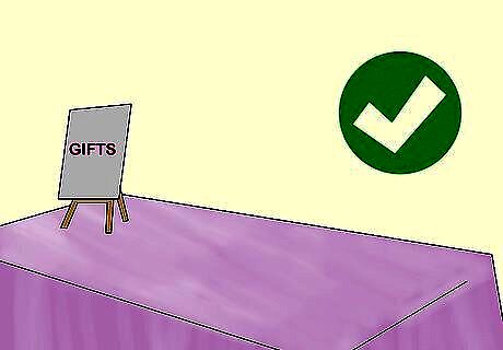 Create a gift table that is functional but beautiful. Place the table close to the front door so the guests can set down their gift first thing. Cover the table with a pretty tablecloth that ties into the rest of your décor. Place a sign on the table to let your guests know it is for gifts. Resist the urge to add anything else to the table because it will just get moved! Use a tall, wire picture holder for your sign so it can still be seen once there are some gifts on the table. Make a banner or sign to designate the gift table. Hang it on the front of the table to save the space for gifts.