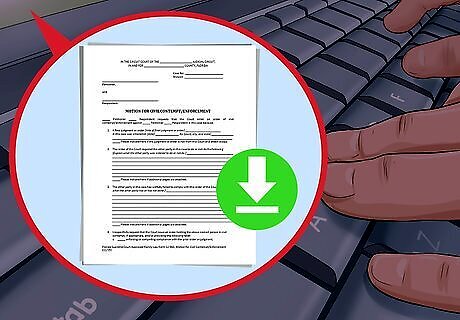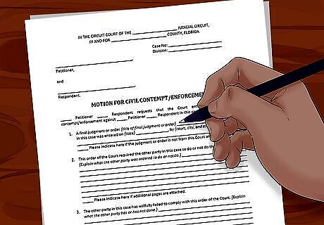 Complete a motion for contempt. You enforce the injunction by filing for “contempt.” The process differs depending on your court. Often, however, the court should have a printed form you can use. Download it from the court’s website. You generally have to tell the judge the following: The date you received the injunction. The substance of the injunction (what it ordered the other party to do or not do). How the other party has failed to follow the injunction.