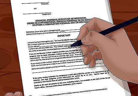 Serve notice on your parents or boyfriend. You need to give the defendant/respondent notice that you have filed the lawsuit. You can provide this notice by sending them a copy of your petition and a “summons,” which your lawyer will get from the court clerk. You can’t personally hand over a copy of the petition and summons to your parents. Instead, you will have to follow your court’s rules for providing notice. Generally, your lawyer can hire a private process server to make hand delivery for a small fee. Alternately, your lawyer might pay the county sheriff or constable to hand deliver the papers to the right party.