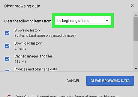 Select a timeframe to delete. Click the drop-down box to the right of "Clear the following items from", then check one of the following: the past hour the past day the past week the last 4 weeks the beginning of time