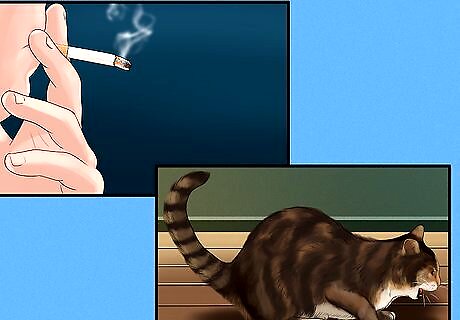 Look for a persistent cough over a period of days or weeks. At first, it might be difficult to distinguish a persistent cough from normal hairballs. Notice if your cat coughs repeatedly over the course of days or weeks. As you make your observations, look for potential environmental causes, such as: Pollen conditions Whether anyone is smoking nearby Any perfume, cologne, or air freshener you’ve used Dusty cat litter Dust inside and outside of the house Contact with other cats with viruses