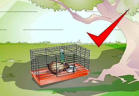 Offer plenty of shade. If you keep your rabbit outside, he should have lots of shady places to rest. This doesn't mean you have to set up a large umbrella or keep your rabbit locked in his hutch. Just make sure there are larger leafy plants or trees under which your rabbit can get out from the direct sun. This is especially important if your rabbit has dark-colored fur which tends to absorb sunlight.