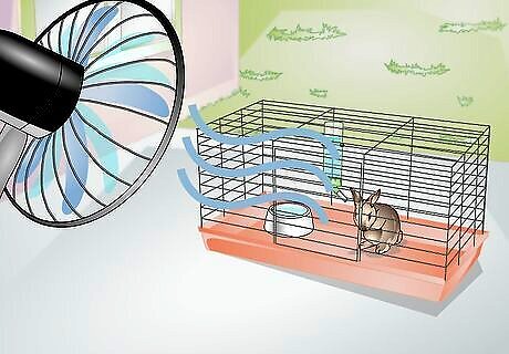 Use a fan. Set up a small fan near your rabbit's hutch or cage. This slight breeze can keep your rabbit cool and prevent overheating. If you set up a fan, make sure your rabbit can't access the electrical cords. Rabbits love to chew, so keep these out of his way.