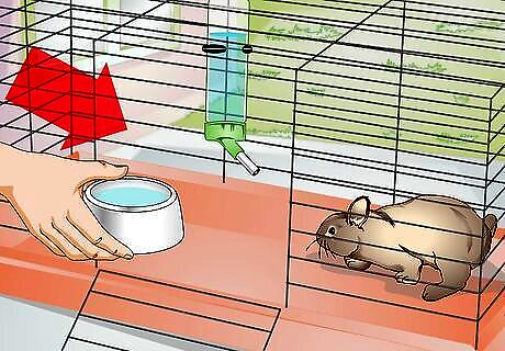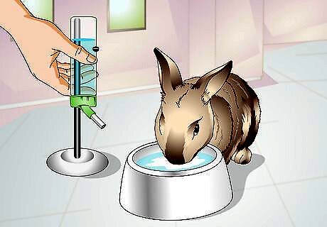 Offer water to drink. Give your water plenty of fresh cool drinking water. Place the bottle water dropper beside him so he doesn't have to move far to drink. You may also set out a bowl of water so your rabbit can choose between it and the bottle water dropper. The main thing is to keep your rabbit hydrated. You can also put ice cubes in the water to keep the water chilly.