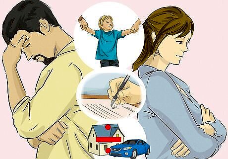 Decide what’s important. If you cannot initially come to an agreement on the terms of the divorce, you might be able to work most of it out if you go about it the right way. Start by making a list of all the items which will have to be negotiated, such as child custody, child and spousal support, alimony, and division of assets and liabilities. Then group then into the following categories: Items which are the most important to you and your spouse. For most people, this is going to be child custody, support, and ownership of the primary residence. Items which are important to one party but not the other. This could include the possession of a personal collection, a car, or a second home. Items which are relatively unimportant to both of you.