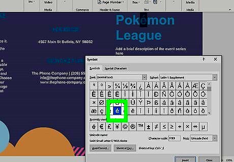 Select an accent from the list. After you've located the accent you want to use (remember to look through the different fonts), double-click one to insert it. Since you have the e selected in Pokemon, the accent should be added over the e so your word looks like Pokémon.