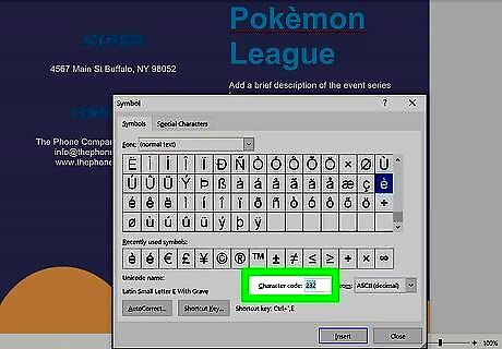 Press the corresponding ALT code. To make the accent over the e in Pokemon, press and hold the ALT key as you type these numbers on the numeric keypad: 0232. The numeric keypad is the one on the right side of the keyboard. When you release the ALT key, you'll see the accent appear over the e. You can find a list of more accents on Microsoft's support page. If you don't have a separate numeric number pad, you can use the method that uses the Insert menu. You can also read How to Use a Symbol When You Have a Laptop.