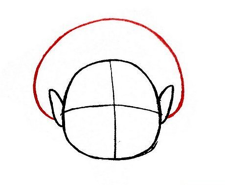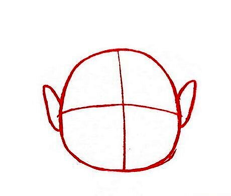 Sketch the head. Draw a circle with a rounded triangle on each side to serve as ears. Draw a cross inside the circle to serve as guidelines for the facial features.