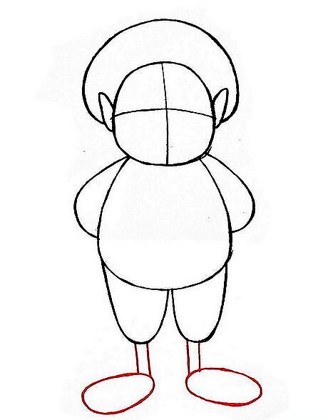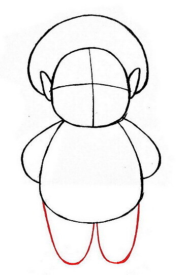 Draw two small rectangles, each connected to a large oval. These will be the ankles and feet.