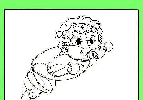 Detail the head and facial features. Outline the face to make it chubby and add big eyes, a small nose, and a smiling mouth. Draw short hair curling around the edges of his face.