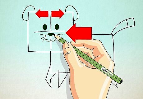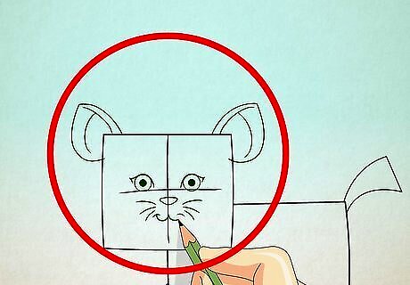Draw the ears using small triangles. Add the eyes using two small darkened circles. Leave a small white circular portion of the eye for the light’s reflection. Draw the nose using an inverted triangle. Draw the mouth using two small curves and add three horizontal lines on each side of the cheek for the whiskers.