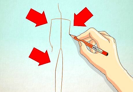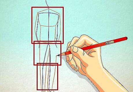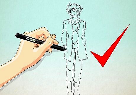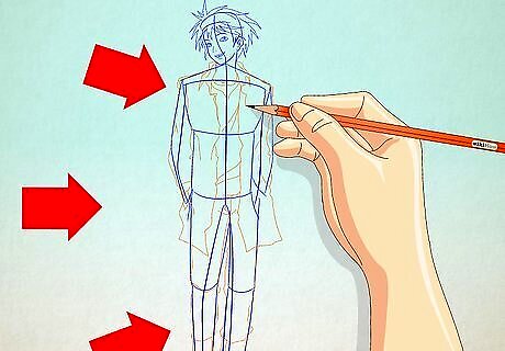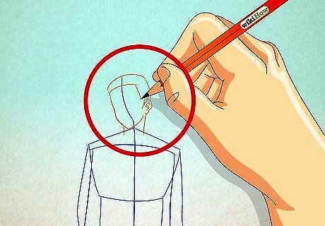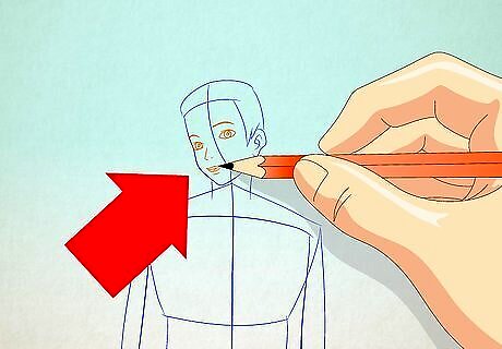 When drawing a guy, remember he is usually more lean and box-like, and you can make him more muscular and defined as opposed to drawing a smooth, curvy outline for a girl. He should be bigger at the shoulders and narrower at the hips, with little or no expansion at the chest or constriction at the waist.