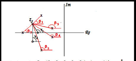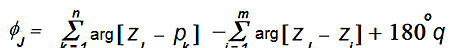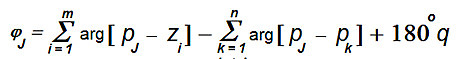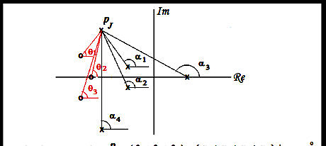 Learn how a branch moves towards a zero. This is called angle of arrival of branch into a zero. Use this relation to calculate it. Let's study what is each factor, J : is the index of the zero under investigation. You like to calculate arrival angle of that specific zero. ɸJ : is the angle of arrival into the zero J. zJ : is the complex value of the zero under investigation. k : roams among the number of poles from first pole ( k = 1) to n-th pole (k = n). zJ – pk : is the evaluation of zJ at pk. i : roams among the number of zeros from first zero ( i = 1) to m-th zero (i = m). i = J apparently has been forbidden to participate. But, even not, has no meaning; it results zJ – zJ = 0; with nought participation. zJ – zi : is the evaluation of zJ at zi. arg : shows that you are calculating smallest angle of the vector insides the brackets [ ... ] with respect to the real axis. q : is an odd integer. Most of the time just q = 180° is enough.