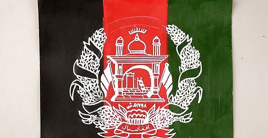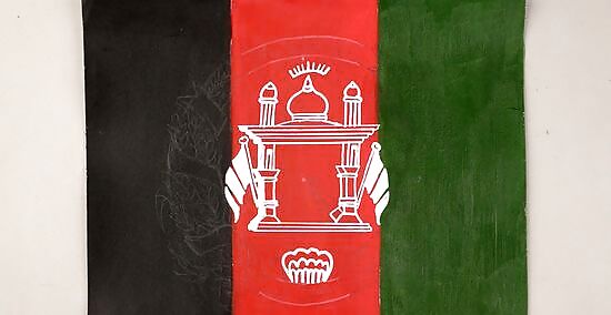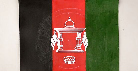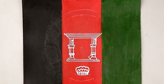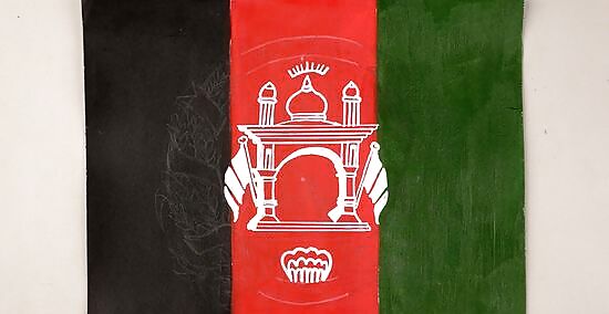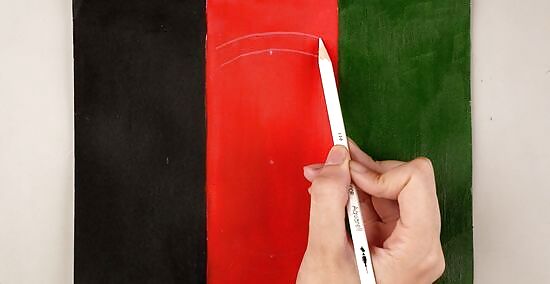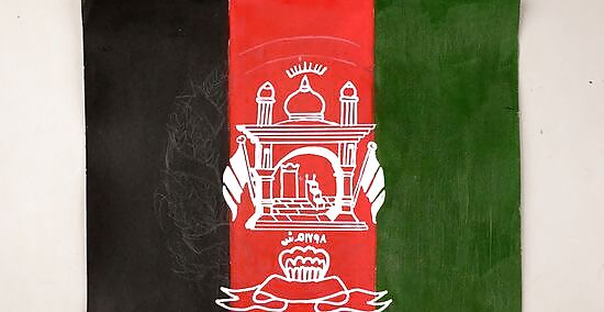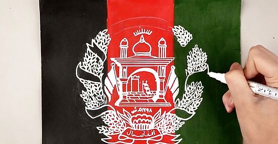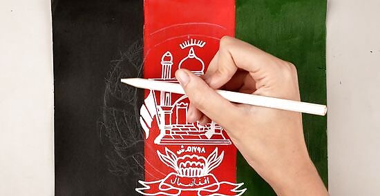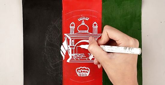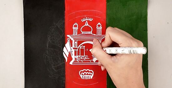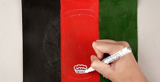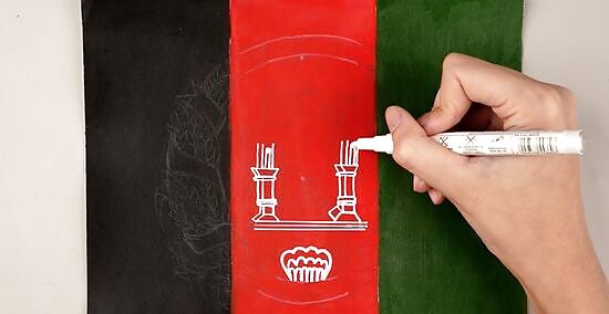 Color the vertical bands. The black band on the left symbolises the painful past of Afghanistan. The red band in the middle symbolises the bloodshed of those who died for their freedom. The green band on the right represents hopes for peace in the future.