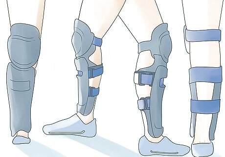 Put on your padding. Start with your leg guards; hockey style knee guards are the best protection for the legs because they protect the knee and shin. Next, pull on elbow pads. Finally, you may want to use rollerblading wrist guards.