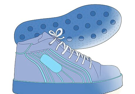Slip your shoes on and lace them up. There are specialty shoes for broomball, but most recreational leagues do not allow them. Hiking boots are also commonly banned. Regular tennis shoes will work just fine. In order to improve traction on the ice, make sure the bottoms of the shoes have good tread. Tie the laces in a double knot to make sure they stay tied.