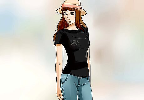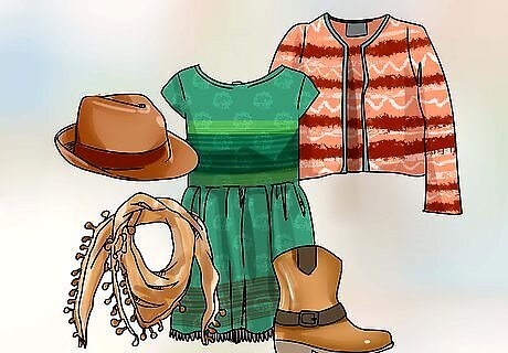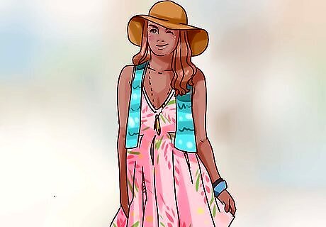 Select a patterned dress for a more feminine look. Earhart designed and occasionally wore dresses. Choose a floral print or polka-dot dress in neutral colors, like black and white or cream and navy. The dress should either be full-length or hit below the knee. Cinch a belt at your natural waist and finish the look with a pair of pumps and a wool cloche hat. A drop-waist dress was favored by Earhart, so consider trying that style.