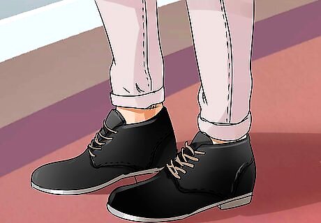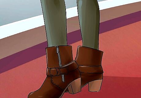 Choose pumps or leather boots for a more feminine style. If you want a more ladylike shoe, opt for a neutral-colored pump to go with your two-piece skirt suit or dress. Look for one with a two-tone heel under 2 inches (5.1 cm). You can also pick a leather boot with a low heel. Avoid boots with zippers or lots of metallic details.