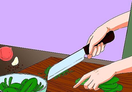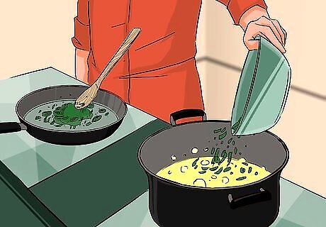 Add vegetables to the butter. Chop up about ½ cup (120 mL) green onion. Wild onion, another spring harvest plant, can be used instead of store-bought onion. The soup can be made with only onion and sorrel, but you may also add celery, carrot, and lentils.