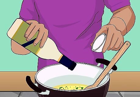 Add the wine. Turn up the heat to medium. Pour in a splash of dry white wine. You don't need much, so add enough to spread out along the bottom of the pot. Wait for a minute as it cooks off.