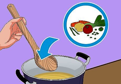 Combine the stock with the vegetables. Pour the stock into the pot with the onions and other vegetables you used. Use a whisk to stir the pot as you do this. Keep this pot at a simmer.