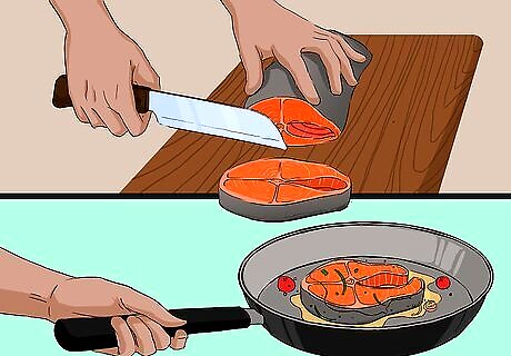 Begin cooking the salmon. Slice up 1 ½ lb (.68 kg) salmon. Combine it with one tablespoon (15 mL) of shallots, dry white wine, and ½ cup (120 mL) chopped tomatoes in a saucepan. One way to make the sauce is to add cream to the wine after simmering, then combine it with wilted sorrel.