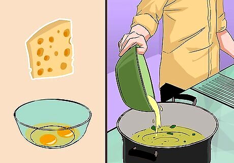 Add the egg mixture to the sorrel. Dump the whisked egg into the pot with the sorrel and onions. Also, add in 2.5 oz (70.9 g) grated Gruyere cheese.