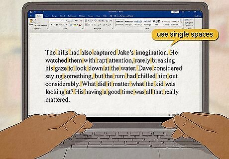 Use only single spaces. Many people learned to type by putting two spaces after each period. Today, however, most editors and publishers (with relatively few exceptions) only use a single space. Having two spaces after each punctuation mark forces the editor to comb over your entire manuscript and take out the unnecessary spaces. You can save your editor a lot of time and effort (and thereby make your manuscript more appealing) by using the conventional method of only one single space after punctuation marks. If you need to remove extra spaces throughout your manuscript and you're using Microsoft Word, you can use the "find and replace" function. Simply navigate to "Edit," hover your mouse over "Find," and click "Replace." In the "Find what" section, type the space bar twice, and in the "Replace" section, type the space bar once. Then click "Replace All."