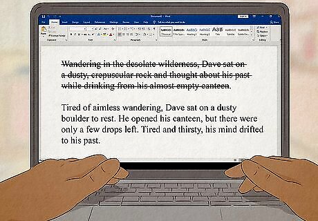 Make changes at the sentence level. Once you've taken care of the larger issues like plot and structure, you'll need to take a close look at the language that you use in each line. Look for consistency in your line work and strong, well-polished sentences. Make sure that the point of view and tense stay consistent. Don't suddenly jump from one person's perspective to another, or from past tense to present or future tense. Are there any awkward sentences that are confusing, clunky, or just poorly written? What about run-on sentences? Never-ending paragraphs? Remember that readers tend to prefer short, action-packed paragraphs instead of long-winded, drawn-out ones. Look for and replace/remove "crutch words" - those words and phrases you tend to fall back on out of comfort or over-reliance. Instead, try rephrasing those sentences with fresh, original prose or cutting these parts out altogether. Find any sentences that are unnecessary ("filler" lines) and cut them out. No matter how much you may like the way you composed a line, if it's not essential and doesn't contribute to the plot or to any character's development it's a waste of space.