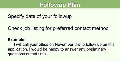 Outline the next step. Depending upon the contact information you have for the company, write that you will follow up next week with a phone call or email to ensure your application was received. Tell the employer that you can also answer any preliminary questions at that time. Include this kind of action that you'll be taking in order to demonstrate initiative. This will also help move your application forward. For example, write: “I will follow up my application with a phone call next week.” It is very important that you follow through on the promise you make in your cover letter. If you say you’re going to follow up on your application, do so. It is also important to note if a company requests no phone call inquiries. If this is the case, email instead.