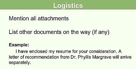 Mention any enclosures. Your application may require that you send a resume, writing samples, or other materials with your cover letter. Mention that you are enclosing them in the envelope or attaching them to the email you're sending. "My resume is enclosed" or "I am enclosing my resume" are both fine ways of putting it. If you are including recommendation letters that will be sent separately by your references, you might write: “Recommendation letters from Dr. Patricia Smith and Dr. Joseph Johnson will arrive under separate cover.”