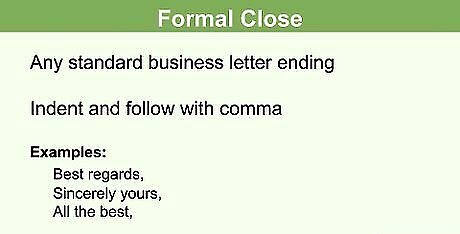 Choose a closing word or term. When you're writing a business letter, your closing word or term options are limited, but you should still choose carefully. Be sure the closing is in keeping with the tone of your letter and appropriate for the type of company to which you're applying. "Sincerely," and “Regards,” are old standards that are fine to use for any employer. "Best regards," or "All the best," are commonly used in business situations these days, and both are safe bets. "Warmly yours," or "With gratitude," are less common, but if you know the person who is reading your letter, you might choose one of these options. Don't use them if you're writing to someone you've never met. Capitalize only the first word in the phrase, and end the phrase with a comma.