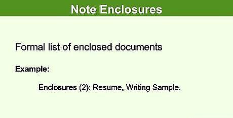 Make note of enclosures under the signature block. For a formal business letter, you need to tell the reader that the letter has enclosures. You should make mention of them within the body of the letter, but you should also make note by typing “Enclosure” or “Encl.” underneath the signature block. Standard business letters typically describe each enclosure: “Enclosures (2): Resume, Writing Sample.”