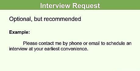 Ask for an interview. Most applicants don’t explicitly state that they would like an interview for a job. But some experts think that you’re more likely to get an interview if you ask for one. For example, you can write: “Please call me at (your phone number) to schedule an interview at your earliest convenience.”