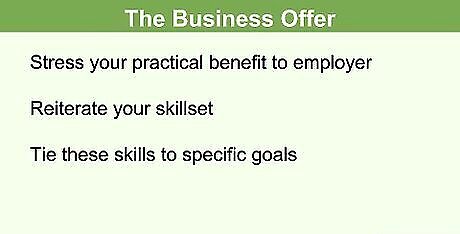 Reiterate how you will contribute to the company. Remind the employer how your skillset will transfer to the company and be put to use. What will you bring to the company? Focus on how the company will improve by hiring you, rather than how you will benefit. For example, you might write: “My professional skills in marketing, coupled with my passion for your products, will enable me to help grow the business segment.”