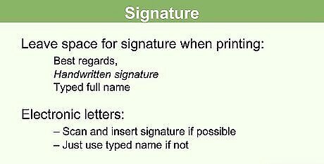 Type and sign your name. Leave four lines blank and then type your name. If it’s appropriate, include your title as well. Include your signature above your typed name. Sign with a good quality pen in blue or black ink. If you are sending an electronic cover letter, it’s still a good idea to include your written signature. You can create a digital signature by signing a piece of paper, scanning it into the computer, and creating a digital image file. Paste this image into the signature area of your letter.