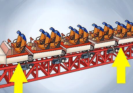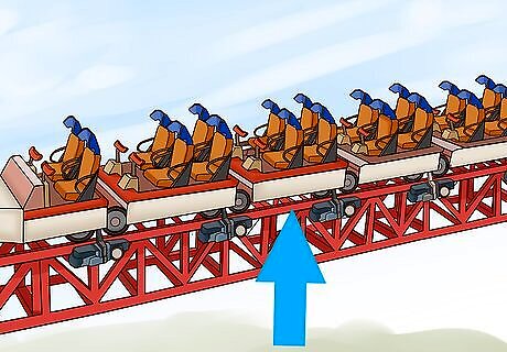 Sit in the middle of the train. Once you have decided to ride a specific roller coaster, you have to pick what part of the train you want to sit in. Each portion of the train will experience the ride a little bit differently, and even if the coaster itself is a good fit, certain parts of the train may not be right for you. For first time or inexperienced riders, the middle is the best spot to sit in because it offers the mildest ride. Sitting in the front gives you a view of exactly where you are headed, which may seem comforting in theory but can actually be scary for first time riders. The back of the train experiences the highest speed going down hills and tends to have the roughest ride around curves.