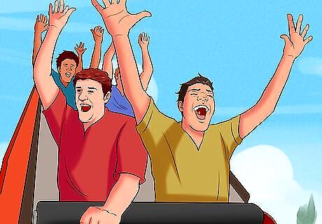 Change how you ride. If you have only been riding for a while, maybe you have spent most of that time holding onto the lap bar or harness. Take the step of letting go and raise those hands up for the whole ride, as long as this is an option. If you have ever kept your eyes closed before, try keeping them open and seeing all the different views along the way. You may have noticed people tend to scream on roller coasters. This can be a fun way to release any lingering fear you may have during the ride.