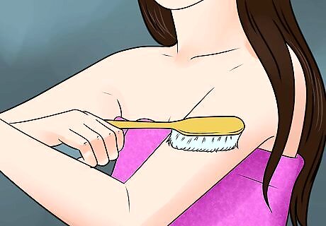 Obtain a natural bristle body brush. A loofah can also work well to brush sensitive skin. Avoid using a synthetic brush, as it will be too stiff and can cause scratches on the surface of the skin, which could lead to even more dry skin. Use a soft brush with a long handle for ease of use and maximum comfort.