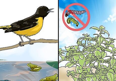 Use natural means of discouraging pests. Chemical pesticides are generally not used, or at least not used heavily, on organic farms. Explore natural options to deflect pests as you maintain your organic garden. Leave a small source of water in your garden as this will attract natural predators for pests. A garden that contains frogs, birds, toads, and lizards can help ward off pests. Consider placing nets and row covers over your plants to keep pests out. Look into naturally occurring bacteria, horticultural oils, insecticidal soaps, and sprays made from garlic and hot peppers. Check to make sure your plants are getting enough light, nutrients, and moisture. Healthy plants are more able to fight off pests.