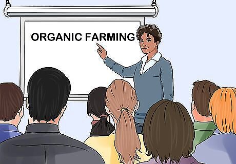 Try enrolling in a training program prior to starting your farm. Colleges and universities may offer courses on organic farming. If you plan to farm for a profit, formal training can be a major asset. You also may find a local organic farm that offers training to farmers who are just getting started. As organic farming has a certain science behind it, training is a good idea if you're serious about starting your own organic farm. You want to make sure you're able to grow a large amount of crops so you can sell them for profit. Training will teach you how to best assure your crops grow, and also tips about harvesting and packaging your crops for sale. Training is also an excelling networking opportunity. You will meet other aspiring farmers who can help you find a market for your crops. Many of your teachers may already farm professionally, and may have connections for you down the road.