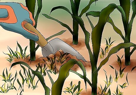 Weed your garden. As you will not be relying on chemicals to reduce weeds in your garden, it will take a lot of work on your part to keep weeds at bay. You will have to manually weed your garden regularly to make sure your organic crops thrive. To weed, you will have to go into your garden yourself and pull up any weeds at the roots. You may have to use tools, like a spade, and you should also wear gloves. If you can't bend over yourself, think about hiring neighborhood kids to assist you with the gardening. Mulch, straw, and wood chips can be scattered around the base of plants to reduce the growth of weeds. Straw is the cheapest option, but does not last long. Wood chips are expensive, but may need replacing less frequently than other options. Avoid using lawn clippings on plants that do not require a lot of nutrients, as they're high in nitrogen. Lettuce and squash would benefit from lawn clippings.