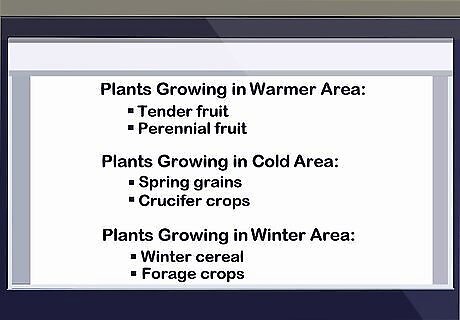 Take climate into consideration. You will not be able to grow any type of plant you want on your farm. The climate in your area affects which plants can be grown organically. You will have to choose plants that fare well in your area's climate. Plants that require a different climate may only grow with the use of chemicals and pesticides. If you live in a cooler area, it may be difficult to grow certain plants. Tomatoes and tender fruit, for example, are best grown in a warmer area. Spring grains and crucifer crops may do better in a cold area. You should also take winter into consideration. The survival of perennial fruit plants, as well as winter cereal and forage crops, depends on the severity of your area's winters. You should always read up on any crops you choose and know which temperatures are too warm or too cold for them to thrive. Select plants that could reasonably survive given your area's climate. EXPERT TIP Steve Masley Steve Masley Home & Garden Specialist Steve Masley has been designing and maintaining organic vegetable gardens in the San Francisco Bay Area for over 30 years. He is an Organic Gardening Consultant and Founder of Grow-It-Organically, a website that teaches clients and students the ins and outs of organic vegetable gardening. In 2007 and 2008, Steve taught the Local Sustainable Agriculture Field Practicum at Stanford University. Steve Masley Steve Masley Home & Garden Specialist Think about your growing season, as well. Select plant varieties that are adapted to the seasons in your area. If you live somewhere with a short growing season, for instance, pick a variety that ripens early in the season. You can also start your plants indoors early, then put them outside after the last frost.